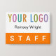 Easily personalize our rectangle pin back button badge with recipient name or other custom text. It attaches with a safety pin back. Sold in orange and other colors (all colors are customizable). Our rectangle buttons are 3.5 inch x 2.5 inch. Made in USA. No minimum order quantity and no setup fee.