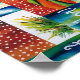 Poster designed from my original whimsical watercolor painting of a vibrant orange surfboard, ocean, waves and palm trees.
