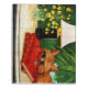 An orange tabby is looking through reading glasses at a bee. The bee is on top of the books looking at the cat. At the rear of the table is a vase of Oncidium orchids. Behind some of the petals is a tall lamp with a black cylindrical base . A soft glow comes through the linen lampshade and casts highlights on the palm leaves behind the cat.