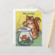 Word on note card note "Kitty Greetings" but can be changed to make your own custom greeting card message. Art features an orange tabby cat with a raised paw over a goldfish bowl. Make your own custom cat lover gifts with personalized messages!