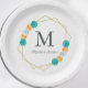 Orange ranunculus, white rose and teal floral wedding design on a geometric frame