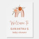 This adorable baby shower welcome sign features trendy boho style and trendy handwritten script that says "welcome." A terracotta and neutral cute painted rainbow is decorated with orange and peach watercolor flowers on a simple white background.