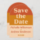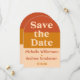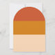 A bold, minimalist design with retro seventies typography and modern orange and terracotta color blocks in a stylish arch invite