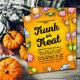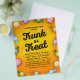 Promote your Trunk or Treat Halloween event with this fun flyer featuring a colorful candy border frame, a yellow orange burst gradient background, and black rugged typography. Customize the template to your liking.