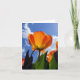 Bug's-eye view of a bright orange spring tulip against a blue sky.