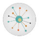 This fabulous mid century modern round cutting board features an atomic starburst in the colors of turquoise blue, two shades of orange, cream, and black. This will make a colorful, and practical, addition to your kitchen decor!