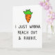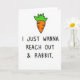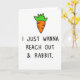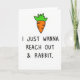This card features a white background with a simple, cartoon-style orange root vegetable centered near the top, outlined in black with a spray of bright green leaves. The vegetable’s upright placement feels like a friendly wave, as if it’s leaning in to get your attention like a close friend. Beneath it, a single line of text sits centered across the lower half, reading “I JUST WANNA REACH OUT & RABBIT” in black, all-cap letters. The lettering has a casual, slightly uneven look that matches the drawn outline above and keeps the joke feeling relaxed rather than formal. The orange and green colors stand out strongly against the white space, making the design easy to take in at a glance. A tiny 🌷 or 🐇 fits naturally with the theme, adding a small nudge toward springtime without crowding the layout. The green leaves fan outward in short strokes above the vegetable, while the black outline stays crisp around the tapered shape.