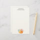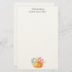 Personalized stationery with a watercolor illustration of an orange pumpkin decorated with colorful fall leaves and sprigs.