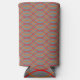This seltzer can cooler has a Boho design of orange and red waves on a field of gray.