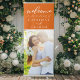 This bold orange wedding banner features your favorite vertical couple photo from your engagement photo shoot. Modern, simple white typography above your photograph on this bright welcome sign.