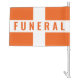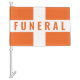 Funeral procession flag in orange with a white cross and FUNERAL written across in clean orange letters.