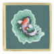 A whimsical and cute orange and white koi carp fish that swims cheerfully on a muted teal background.