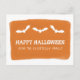 Trendy and fun Watercolor Bats Halloween Postcard with an orange watercolor look background and three whimsical little white bats. This simple and modern card can be easily customized with your own Halloween greeting. Find more customization options by clicking Customize It.