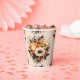 Paper cups with an elegant yet goth style flower bouquet. Composed of orange tulips, yellow daisies, gray leaves and sprigs and some orange berry accents.