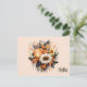 A postcard with an elegant yet goth style flower bouquet. Composed of orange tulips, yellow daisies, gray leaves and sprigs and some orange berry accents.