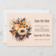 Save the date card with an elegant yet goth style flower bouquet. Composed of orange tulips, yellow daisies, gray leaves and sprigs and some orange berry accents.