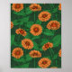 Orange Zinnia flowers, green leaves on dark green Poster