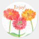 A colorful sticker with "Enjoy" decorated with three zinnia flowers in shades of red, pink, and orange with watercolor and touches of spatter in the background for added color. In the Language of Flowers zinnias mean thoughts of absent friends. Cheerful finish to your packaging!