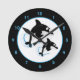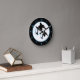 Two beautiful and graceful black and white Orcas, are playful and jumping while swimming in the ocean. Orcas are also known as killer whales. The numbers are blue on a black frame surrounding the clock face. There is also a thin blue outline around the clock face.