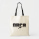 Black and white Orca Killer Whale graphic print tote bag. The word ORCA in bold letters, with small killer whales printed beneath.