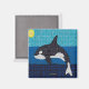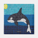 Artistic depiction of an orca whale in the ocean, illuminated by a vibrant sun in the background.