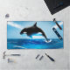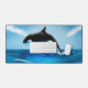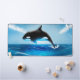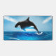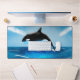 This lively illustration of an orca whale is sure to bring life any one's desk or computer space! The whale, sometimes called the killer whale, is leaping out of the ocean. Water is dripping from the whale and the water shows movement as well. Blue colors are bright bring out the black and white of the orca whale.