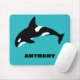 Create a personalized gift for someone who loves whales and other ocean animals. This mousepad features an illustration of an orca or killer whale in black and white set against a bright teal blue background and is ready to be personalized with a name or other text in bold black lettering.