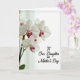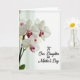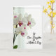 The front design shows a small cluster of white orchid blossoms arranged along the left side, their smooth petals opening to reveal fuchsia and deep reddish-brown centers that feel like little hearts ❤️. A slim, dark stem runs downward with a hint of soft green near the lower edge, adding a natural touch without crowding the space. Gentle, diffused light glides across the waxy petals, giving them a slightly translucent look and a calm, affectionate mood, like a quiet hug between close family members. The background stays mostly bright white, with a faint light-gray border that subtly frames the scene. On the right half, a flowing black handwritten-style message reads “To Our Daughter on Mother’s Day,” balancing the flowers on the opposite side. The text sits centered vertically on the right, leaving generous white space around it so the words feel tender and unhurried 🌼. The orchid centers show fine curved details and rich color, standing out sharply against the luminous white petals.