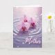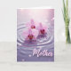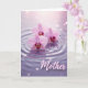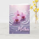 This Mother's Day card features three pink, orchid-like blossoms floating on lavender-tinted water, with the nearest flower in crisp focus and the other two fading softly into the distance. The front bloom shows fine petal veining and a deep fuchsia center touched with warm golden tones, like a gentle blush shared between close friends ❤️. Subtle concentric ripples spread across the water, catching light in a way that feels calm and intimate, as if the flowers are drifting together. In the background, soft, out-of-focus light spots shimmer like distant reflections, adding a dreamy layer to the pastel pinks and purples 🌼. The word “Mother” sits in the lower right in flowing light-pink lettering, small enough to let the image lead while still standing out against the water. The overall layout keeps most of the space open and airy, with the flowers clustered slightly left of center and the text tucked neatly to the side. Pale highlights skim the ripple edges, and the farthest blossom is a gentle blur near the upper left.