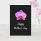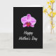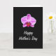 This card features a single orchid bloom filling the upper half, with purplish‑pink petals set against a deep black background, like a quiet spotlight on someone dearly loved ❤️. Fine vein details run through each petal, and a thin white outline traces the edges to create a soft glow that feels like a gentle embrace. Near the center, deep magenta blends into warm orange‑yellow, giving the flower a warm, welcoming heart. The overall layout is simple and calm, letting the flower’s tender, open shape suggest closeness and care. Across the lower portion, the words “Happy Mother’s Day” appear in flowing white lettering, centered beneath the blossom. The text sits comfortably in the dark space, balancing the composition and guiding the eye upward toward the flower. A small 🌼 accent is hinted through the warm tones near the orchid’s core, while the black background stays smooth and uninterrupted behind it. The petals curve outward with a bright white edge, and the message remains crisp in white near the bottom.