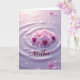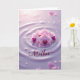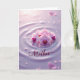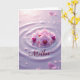 Designed with a serene floral scene, this card centers on a small cluster of light pink orchids resting on a softly rippled surface tinted lavender. The petals fade from pale blush to richer magenta and deep purple near the centers, where tiny golden accents add a gentle sparkle. A faint mirror-like reflection sits beneath the blooms, giving the flowers a close, tender presence, like a quiet moment shared with someone you love ❤️. Soft, diffused light spreads across the background, highlighting round ripple rings that feel like careful, affectionate placement. Small clear droplets are scattered around the flowers, catching the light like dew and adding a calm, romantic shimmer 🌼. Near the lower front area, the word “Mother” appears in flowing lettering, set in a deep reddish-purple color that stands out against the pale surface. The orchids sit slightly above center, with the lavender ripples and tiny droplets extending outward into the corners.