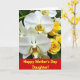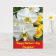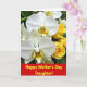 Designed with a lush floral scene, the card features a close cluster of white orchids paired with sunny yellow roses, set against deep green leaves. The orchid petals look smooth and gently curved, with faint lines that catch the light, and their golden centers show tiny reddish-brown touches that draw your eye like a quiet, affectionate glance ❤️. Tucked beside them, the yellow roses open in tight spirals, giving the arrangement a cozy, friendly warmth 🌼. Soft lighting across the blossoms and foliage creates a calm, intimate mood, like flowers shared between people who care about each other. Along the bottom runs a wide crimson-red banner that grounds the design without overpowering the blooms. The message sits centered on that banner in bright yellow text, standing out clearly against the red. Above the banner, the orchids dominate the foreground while the roses peek from behind, framed by rich green leaves.