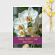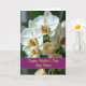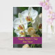 This greeting card features a lush bouquet of large white orchid-like flowers with wide petals that open gently, their centers dotted with deep red specks and touched with sunny yellow accents 🌼. Tucked between them are small, pale yellow roses curling into soft spirals, like they’re leaning in close to the bigger blooms in a quiet show of affection ❤️. The flowers fill most of the front, creating a cozy, abundant arrangement that feels intimate rather than formal. A rich deep purple band runs horizontally across the middle as a strong visual anchor. Centered on that band, the message “Happy Mother’s Day Step Mom!” appears in golden lettering, standing out clearly against the dark background. Soft, diffused lighting gives the petals a light glow and shows off their gentle textures without harsh shadows. Behind the bouquet, an out-of-focus emerald green backdrop suggests leafy greenery and keeps attention on the blossoms and the purple band.