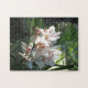 This puzzle shows a photograph of beautiful springtime orchids blooming in a green forest.