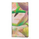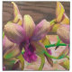 The orchids are blooming again in the garden, in the original photograph on this Cloth Dinner Napkin. The flowers, emerging from a curving green stem, have purple centers which blend into yellow at the tips of the petals. The natural wood background sets off the sculptural shapes and colors.