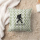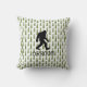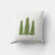 This Oregon Bigfoot Pillow has a background of olive green fir trees and features a silhouette of Bigfoot with the word "Oregon" in a black, distressed typewriter style font. On the back are three coordinating trees.