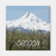 Square fridge magnet featuring a scenic photo image of the jewel of Oregon, Mount Hood, along with blossoming fruit orchards in the valleys below. Makes a great travel souvenir!