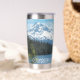 A trendy, stainless steel, thermal tumbler for your hot or cold drinks that features a wrap-around scenic, landscape photo image of snow capped Mount Hood and a peaceful lake in an evergreen forest, located in the Pacific Northwest state of Oregon. Makes a great travel souvenir!