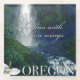 A digital painting of a waterfall found along the switchback trail of Multnomah Falls in Oregon's Columbia River Gorge Scenic Area. The white number in the top corner is the year that Oregon became a state. The white lettering in the center of the painting, "She flies with her own wings", is the state motto. At the bottom of the painting is a white trillium flower next to Oregon in white lettering. A simple dark blue border finishes the painting. Image Copyright ©2023 Kimberly J Tilley.
