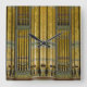 The green and gold painted pipes of the pipe organ in Birmingham town hall, shown on the round clock.