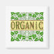 Organic a green slogan for gardeners, cooks and Earth Day celebrations, in decorated capital letters against a background of acorns and oak leaves, surrounded by scrolling leaves.
