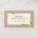 These business cards are for handmade hair products such as hair mask ans serums, and shampoo and conditioner. The design features a modern layered frame with leaves and foliage below on a Kraft background.