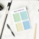 notepads, personalized with your name, for to do lists and daily organizing with four categories: asap, soon, later, whenever. Green, turquoise, yellow, and blue. A practical, clean look.