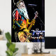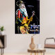 A vibrant, stylized portrait of Orianthi, a renowned guitarist, captured in a dynamic pose. She is holding a guitar, its body adorned with intricate patterns in shades of yellow and orange. Orianthi is wearing a leather jacket with a colorful, almost abstract design, and her long blonde hair flows down her back.