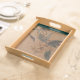 This is a well made, sturdy wooden tray with a flawless black finish and lovely map on the tray surface. It is both vintage & modern at the same time. Looks exactly like the photo; does not disappoint. So nice to find something of quality individually made and not the mass-produced 'shabby chic' merchandise seen in stores. I am so pleased to be able to give this to my college-age niece for her birthday. This can be used as a tray to hold jewelry or toiletries, or hung on the wall as art. The map surface is sealed (it is slightly shiny) so would be moisture resistant. It is well worth the asking price but I was able to apply a sale code as well. Very happy with my purchase. Map is crisp & clear and sealed with a water-resitant finish.
