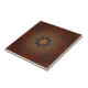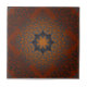 Beautiful ceramic tile design featuring a symmetrical pattern in orange and black colors. The pattern is made up of a central eight-pointed star with a smaller orange star in the center. The star is surrounded by a circular pattern of black swirls and curls. The background is a gradient of orange and black colors.