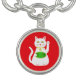 This awesome charm bracelet features a graphic design image of a lucky oriental white waving cat. The cat has beautiful gold eyes and is wearing a gold medallion on the collar around its neck. The cat has pink ears and whiskers. This cute little kitty is holding a golden token with green jade inlay and a message in golden text that says "Good Luck".