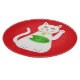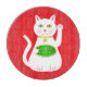 This awesome glass cutting board features a graphic design image of a lucky oriental white waving cat. The cat has beautiful gold eyes and is wearing a gold medallion on the collar around its neck. The cat has pink ears and whiskers. This cute little kitty is holding a golden token with green jade inlay and a message in golden text that says "Good Luck".