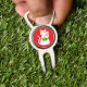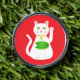 This awesome golf divot tool features a graphic design image of a lucky oriental white waving cat. The cat has beautiful gold eyes and is wearing a gold medallion on the collar around its neck. The cat has pink ears and whiskers. This cute little kitty is holding a golden token with green jade inlay and a message in golden text that says "Good Luck".