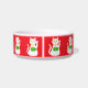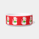 This awesome cat bowl features a graphic design image of a lucky oriental white waving cat. The cat has beautiful gold eyes and is wearing a gold medallion on the collar around its neck. The cat has pink ears and whiskers. This cute little kitty is holding a golden token with green jade inlay and a message in golden text that says "Good Luck".